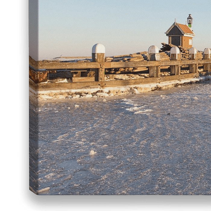 Die Hafeneinfahrt von Volendam. Dieses Foto wurde vom Eis aus aufgenommen. Auf dem linken Wellenbrecher befindet sich ein nicht mehr genutztes Nebelhorn. Auf dem rechten Wellenbrecher eine Statue von Maria, Stern des Meeres. In der Ferne können Sie vage die Silhouette von Marken erkennen.