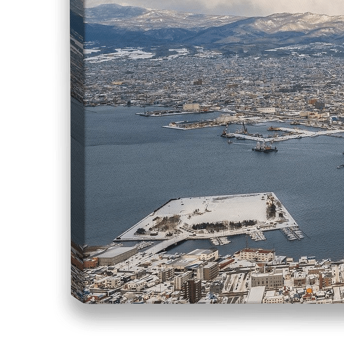 Hakodate vom Berg Hakodate aus gesehen an einem kalten, halb nebligen, halb sonnigen Wintertag. Blick auf das Meer, das die Stadt auf beiden Seiten umgibt.