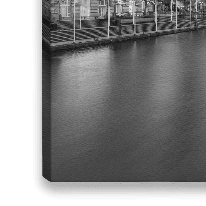 Schwarz-weiß Version des Hamburger Rathauses mit den Alsterarkaden vom Jungfernstieg aus gesehen.
