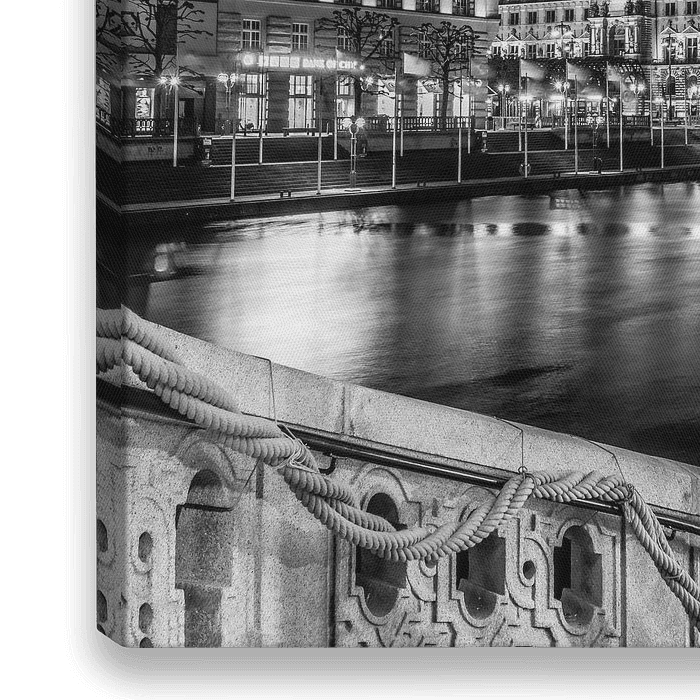 Elegantes Geländer und Blick über die kleine Alster zum Rathaus