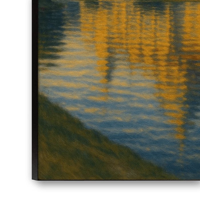 Die Komposition ist durchdacht und kontemplativ: Zarte Wolken streifen den Himmel in Pastelltönen, während die Spiegelung die ruhige Autorität des Bauwerks verdoppelt. Die goldene Fassade scheint von innen heraus zu leuchten, ihr Licht ist sowohl real als auch erinnerlich. Hoppers Einfluss findet seinen Widerhall in der Leere - keine Bewegung, kein Geräusch, nur ein Dialog zwischen Reflexion und Stille.