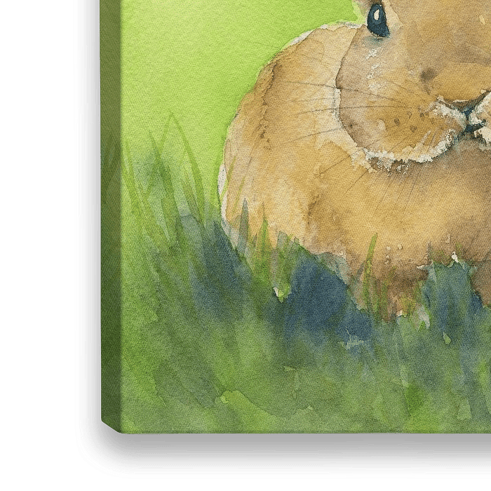 Hase auf der Wiese ist ein handgemaltes Aquarellgemälde im Hochformat der Künstlerin Karen Kaspar. Ein süßes flauschiges braunes Kaninchen sitzt mitten im Gras in einer grünen Wiese und schaut zum Betrachter. Das Bild ist in einem lockeren frischen Stil gemalt.