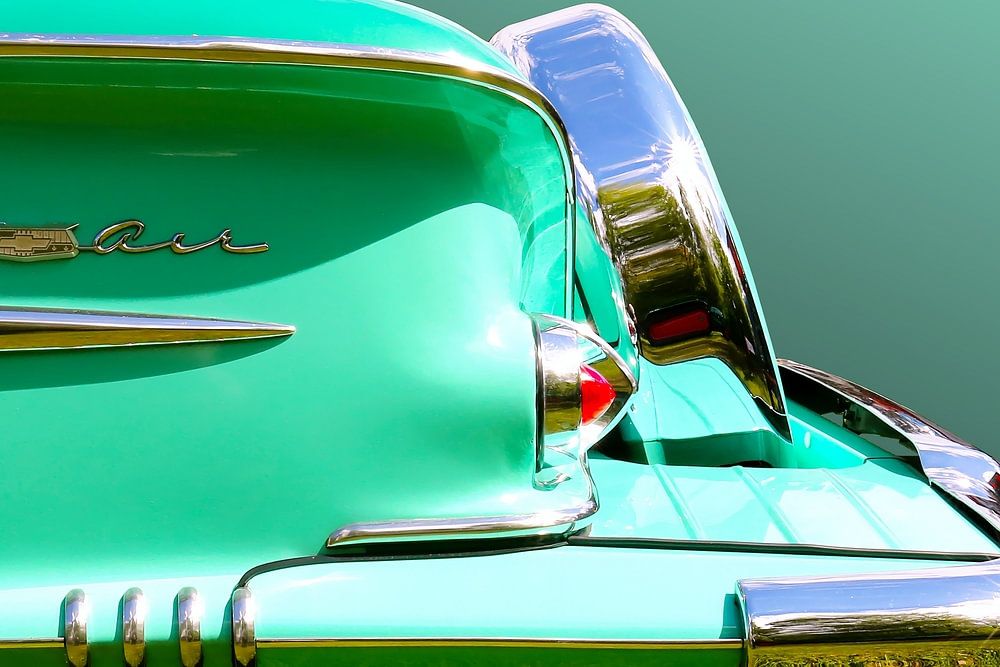 Die Heckpartie eines 1958 Chevrolet Bel Air Impala in brillantem Grün. Das leuchtende grüne Finish kombiniert mit den ikonischen Chromzierleisten, dem eleganten "Bel Air" Schriftzug und den markanten vertikalen Chromakzenten verkörpert den unverwechselbaren Stil des späten Heckflossen-Designs der 50er Jahre.
