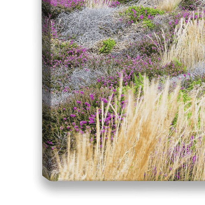 Lila Heidekraut in der Heidelandschaft am Zollweg bei Ploumanach an der zerklüfteten Küste der Côtes-d'Armor in der französischen Region Bretagne. Dieses Foto wurde an einem Sommerabend im Jahr 2015 aufgenommen