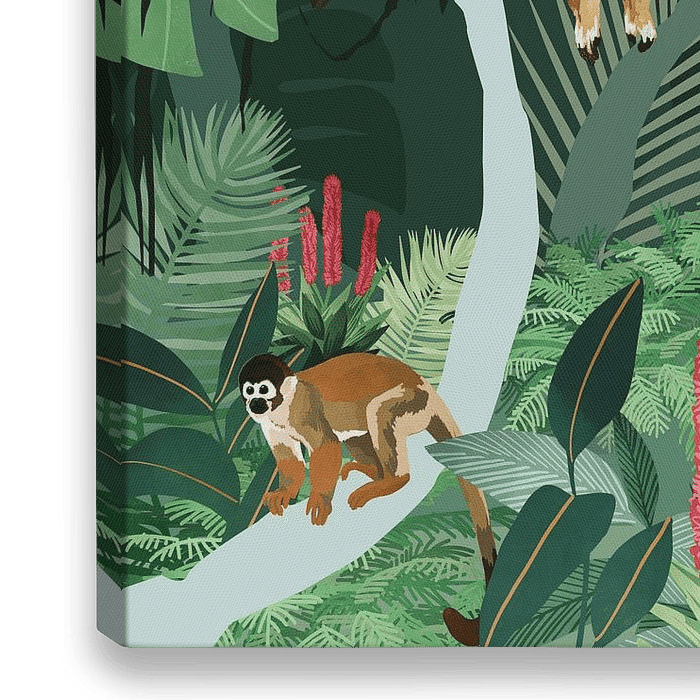 Eine Szene aus dem Dschungel voller Bäume, Pflanzen und Tiere. Eine farbenfrohe, lebhafte Illustration, sehr geeignet als Tapete.