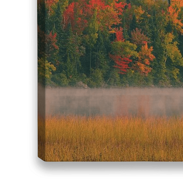 Panoramafoto der Herbstfarben und des Sonnenaufgangs am Connery Pond in North Elba, in der Nähe des Lake Placid im Bundesstaat New York, USA. Hier befindet sich eine der schönsten Aussichten in den Adirondack Mountains.