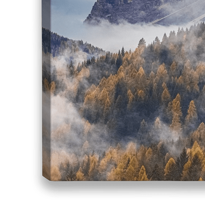 Ein quadratisches 1:1-Foto von tief hängenden Wolken und Nebel inmitten von Bergen und Wäldern mit Herbstfarben im Oktober, zwischen Cortina d'Ampezzo und San Vito di Cadore, in der italienischen Provinz Belluno, Dolomiten, Italien.