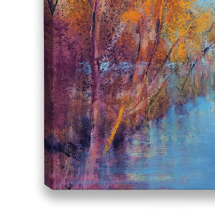 Leuchtender heller Himmel mit weitem Horizont, starker Kontrast mit dem rot und gelb gefärbten Herbstlaub. Das Bild vermittelt Kraft und Lebensfreude. Die intensiven Farben spiegeln sich im Wasser des kleinen Flusses.