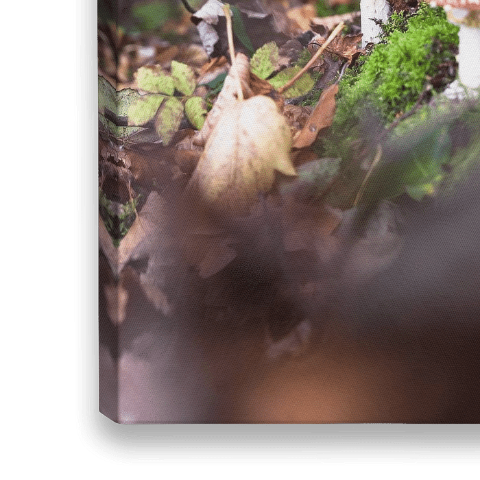 Der Fliegenpilz oder Amanita muscaria im Herbstwald. Detailaufnahme eines Pilzes mit roten und weißen Punkten in einer Szene mit Herbstblättern, Moos und Herbstfarben.
