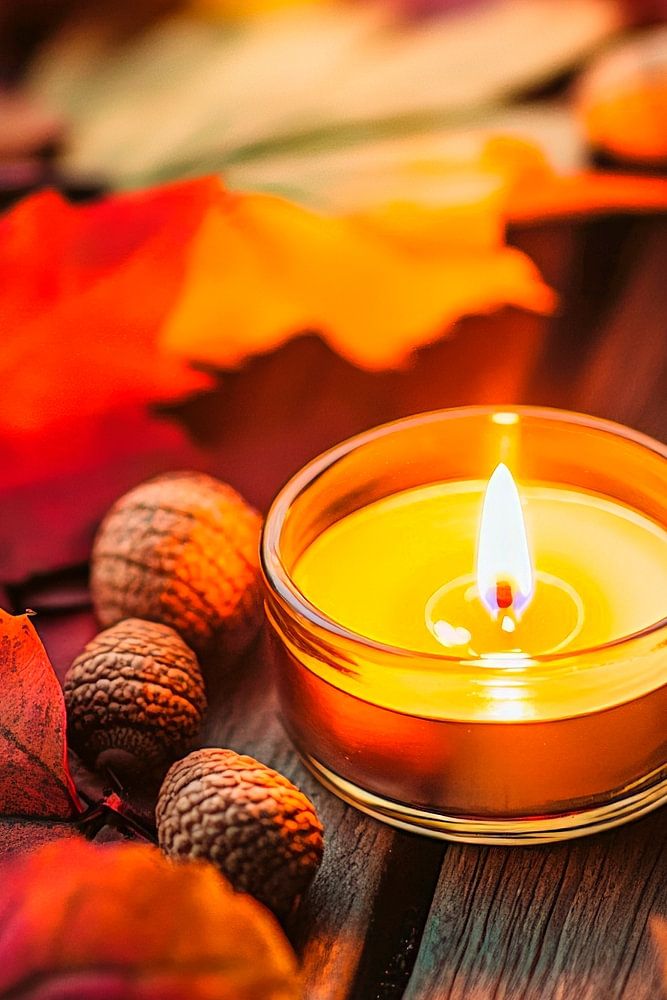 Ein warmes Lichtspiel, umrahmt von leuchtend roten und goldenen Herbstblättern, vermittelt ein Gefühl von Gemütlichkeit und Ruhe. Die sanfte Flamme der Kerze strahlt eine einladende Atmosphäre aus, die perfekt in ein Wohnzimmer oder einen entspannten Leseecke passt. Ideal für Herbstabende, die zum Träumen einladen.