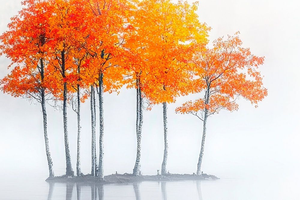 Ein zauberhafter Nebel umschmeichelt eine Gruppe leuchtend orangefarbener Bäume, die in sanften Wasserflächen reflektiert werden. Die harmonische Stimmung vermittelt Ruhe und Geborgenheit. Dieses Kunstwerk eignet sich perfekt für ein Wohnzimmer, um einen Hauch von Natur und Geduld in den Raum zu bringen.