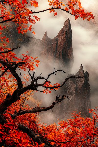 In einem Meer aus leuchtend roten Blättern erheben sich majestätische Gipfel aus dem geheimnisvollen Nebel. Die dynamische Anordnung von Farben und Formen zieht den Betrachter in eine märchenhafte Welt. Dieses eindrucksvolle Kunstwerk bringt Leben und Wärme in jedes Wohnzimmer und lädt zum Träumen und Verweilen ein.
