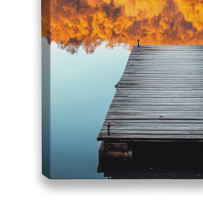 Ein malerisches Zusammenspiel aus warmen Gold- und Orangetönen entfaltet sich, während die herbstlichen Bäume sanft im klaren Wasser spiegeln. Der schmale Holzsteg lädt ein, die Stille zu genießen, während die ruhige Szenerie eine harmonische Verbindung zwischen Himmel und Erde schafft, als ob die Natur selbst zur Meditation einlädt.