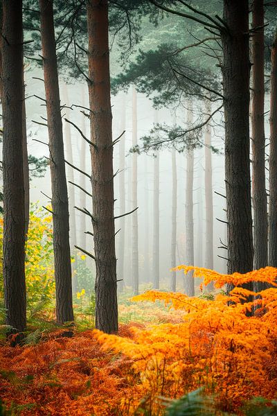 In einem magischen Nebelwald verleihen orangefarbene Farne und majestätische Baumstämme der Szene eine mystische Aura. Die harmonischen Farben und die ruhige Stimmung dieses Bildes laden dazu ein, in einem Wohnzimmer oder einem Schlafzimmer als beruhigendes Element zu wirken, das die Verbindung zur Natur stärkt.