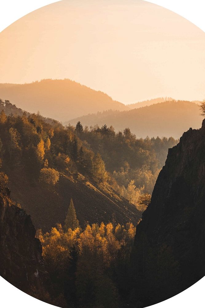 Hier sehen Sie ein Landschaftsbild in runder Form vor einem weißen Hintergrund. Oben auf dem Design steht der Ort und das Land, und unten auf dem Design steht ein schönes Zitat.