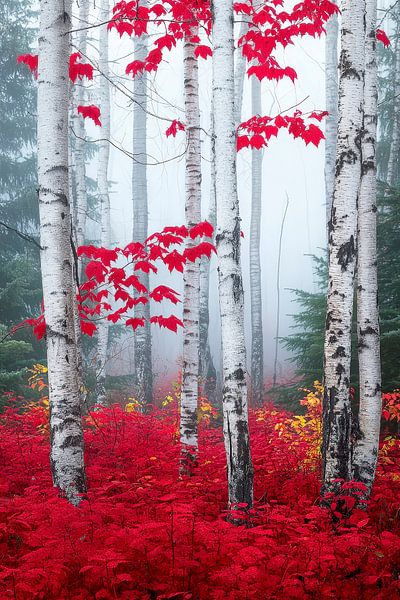 Ein zauberhafter Herbstwald, in dem leuchtend rote Blätter die Szenerie mit einem Hauch von Magie erfüllen. Die weißen Birkenstämme kontrastieren harmonisch mit dem bunten Laub, während der zarte Nebel eine mystische Atmosphäre schafft. Dieses Kunstwerk entfaltet seine ganze Pracht im Wohnzimmer und bringt natürliche Energie in jeden…