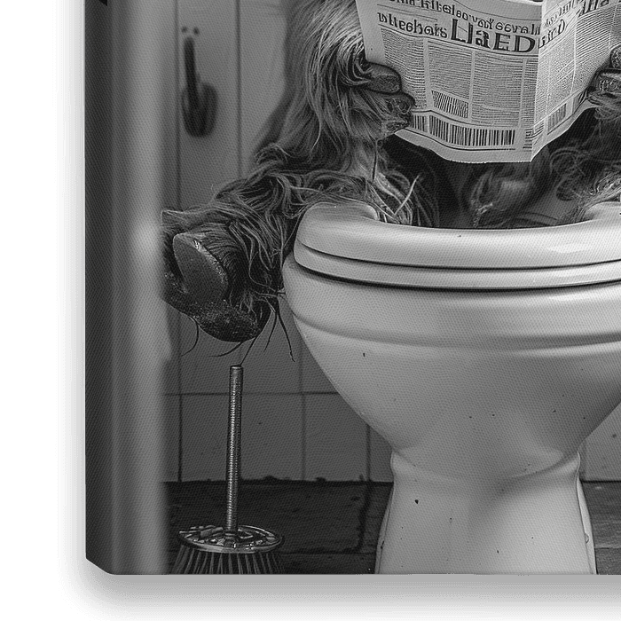 Schwarz-Weißes Bild eines Highland Rinds, das entspannt auf der Toilette sitzt und Zeitung liest.
