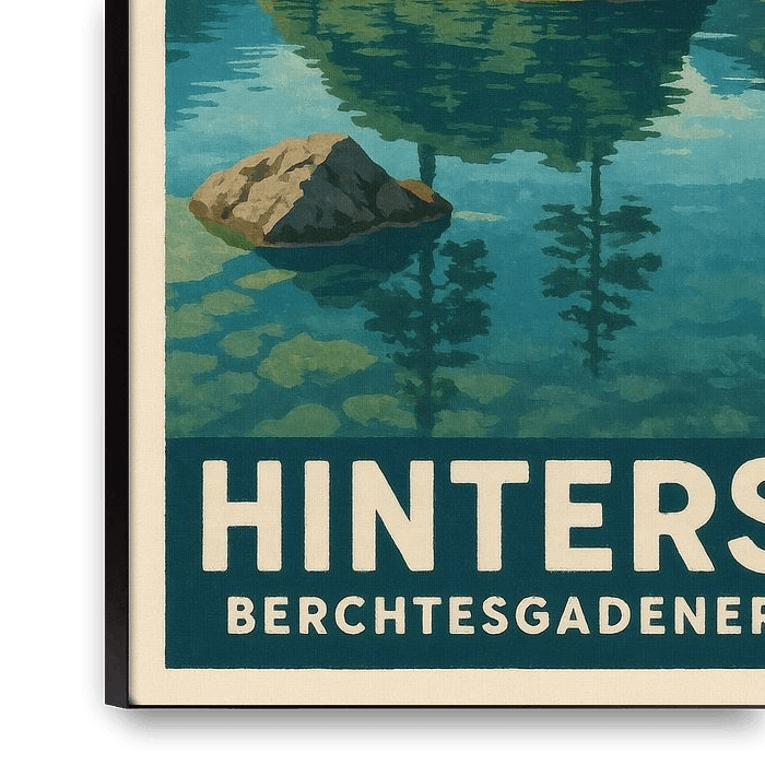 Zwei schlanke Nadelbäume wachsen auf einem kleinen Felsen mitten im türkisfarbenen Hintersee – ein ikonisches Motiv aus dem Berchtesgadener Land. Die spiegelglatte Wasserfläche, die umliegenden Wälder und die schneebedeckten Gipfel im Hintergrund schaffen eine Szenerie von fast meditativer Ruhe. Dieses stilisierte Travelposter wurde auf…