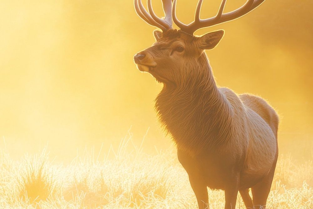 In der sanften Umarmung des Morgennebels steht ein majestätischer Hirsch, seine imposanten Geweihäste ragen stolz in die Höhe. Das goldene Licht bricht durch den Dunst und umhüllt ihn wie ein mystischer Schleier. Mit jeder Faser seines Seins strahlt er Kraft und Anmut aus, während die frostige Gräser unter seinen Hufen glitzern.