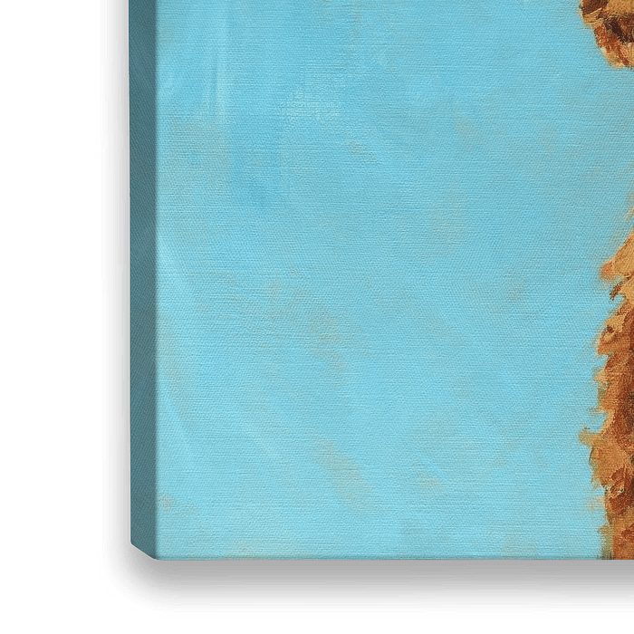 Eine zottelige Hochlandkuh mit dickem, rotbraunem Fell schaut den Betrachter direkt an, ihre langen Hörner ragen nach außen. Der Hintergrund ist einfarbig hellblau und kontrastiert mit der strukturierten Optik des Kuhfells.