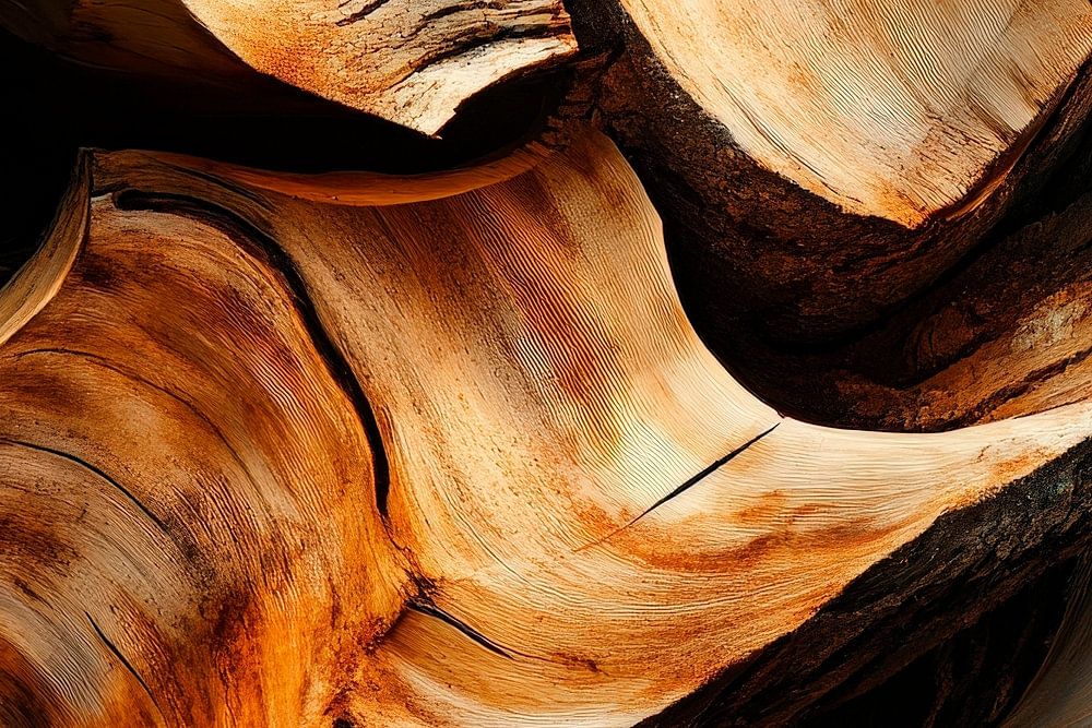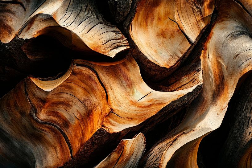 Ein faszinierendes Spiel aus warmen Holztönen und geschwungenen Linien entfaltet sich hier. Die organischen Strukturen und sanften Übergänge vermitteln eine einladende und beruhigende Atmosphäre. Ideal für das Wohnzimmer, um eine Verbindung zur Natur herzustellen und eine harmonische, entspannte Stimmung zu fördern.
