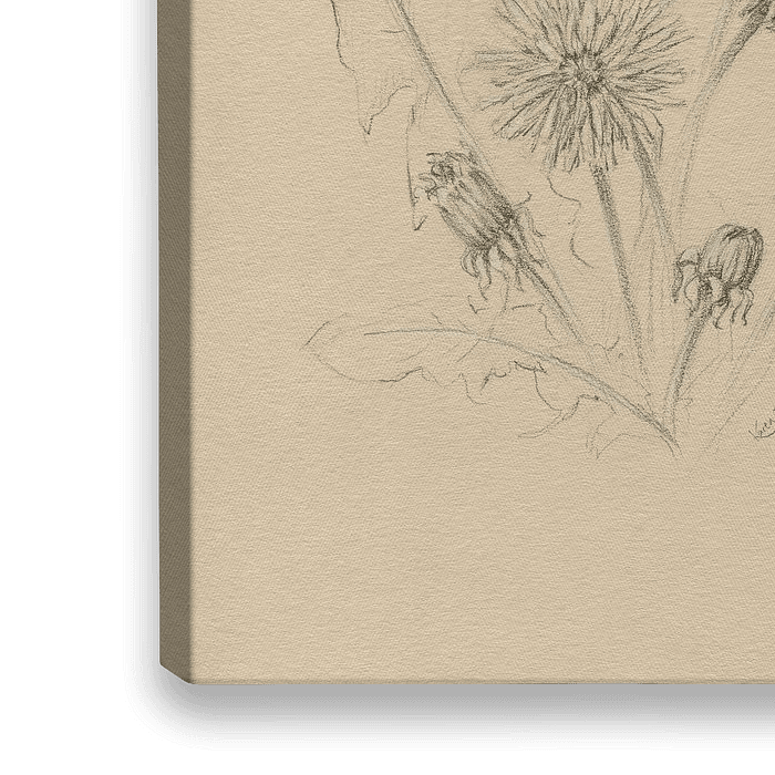 Auf ockerfarben getöntem Papier ist eine Löwenzahnpflanze dargestellt mit Knospen, aufgeblühten Blüten, Blättern und Pusteblume. Einige Fallschirmchen mit Samen machen sich gerade auf den Weg.