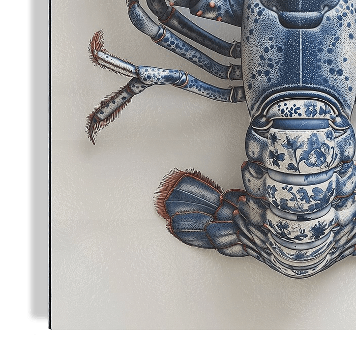KI-generiertes Bild eines Hummers mit typisch delftblauem Panzer vor einem weißen, hellen Hintergrund