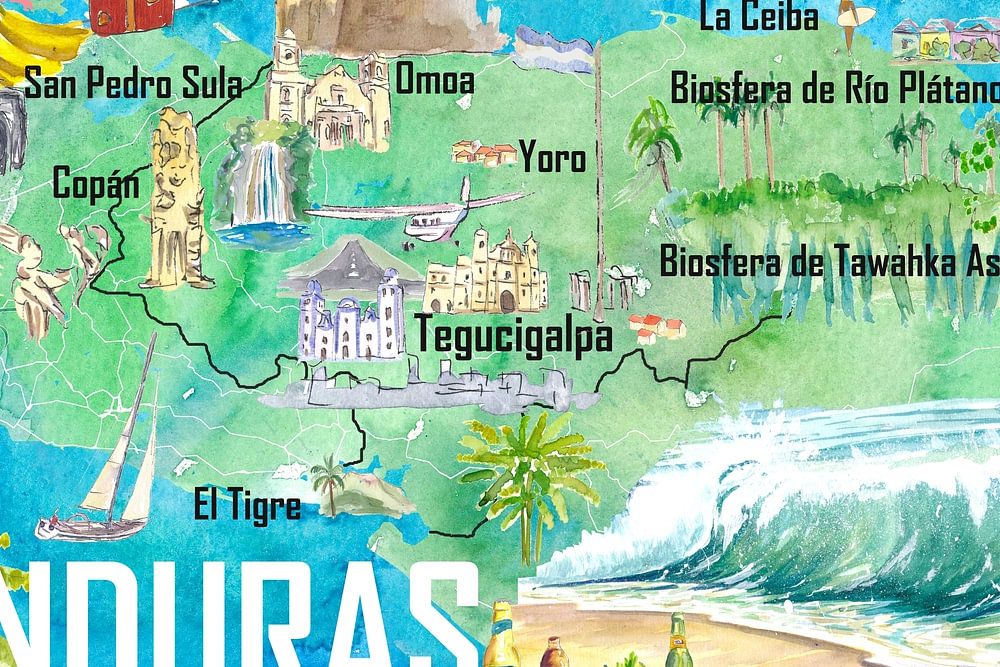 Illustrierte Reisekarte von Honduras mit Straßen und touristischen Highlights
