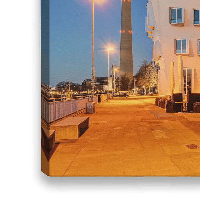 Blick zu einem der drei Gehrybauten am Neuen Zollhof im Düsseldorfer Medienhafen und dem Rheinturm im Hintergrund. Nach Einbruch der Dämmerung wird der Platz in ein orangenes Licht getaucht.