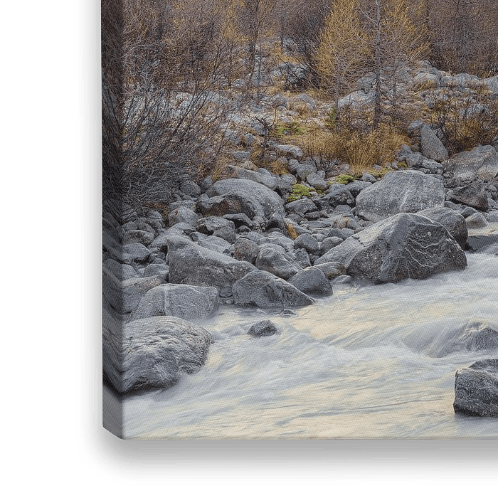 Man könnte meinen, in Kanada zu sein. Doch es ist ein wunderschönes landschaftliches Idyll im Oberengadin in der Schweiz. Der Blick geht entlang des Gletscherbaches zum Morteratschgletscher an einem Morgen im Spätherbst.