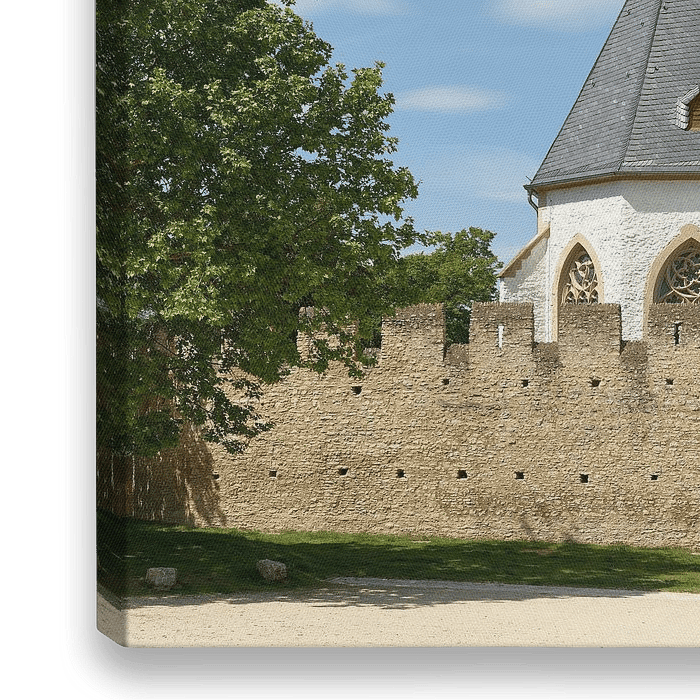 Die Burgkirche in Ingelheim aus dem 15. Jh., umschlossen von einer Wehrmauer. Rheinhessen, Deutschland, Rheinland-Pfalz.