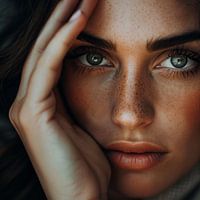 Dieses einfühlsame Portrait einer Frau fängt einen stillen, nachdenklichen Moment ein. Die nahen Details ihrer Sommersprossen, die weichen Gesichtszüge und der intensive Blick schaffen eine Verbindung zum Betrachter. Perfekt für Liebhaber von natürlicher und emotionaler Fotografie, die die Tiefe und Authentizität eines Augenblicks…
