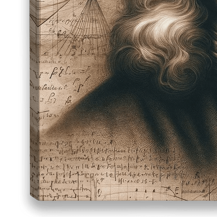 Das Bild porträtiert Sir Isaac Newton, den berühmten englischen Mathematiker, Physiker und Astronomen, dessen Werk das wissenschaftliche Verständnis revolutioniert hat. Newtons ausdrucksstarkes Gesicht blickt ernst und durchdringend, umgeben von Symbolen und Formeln, die seine Arbeit repräsentieren. Im Vordergrund liegt eine sorgfältig…