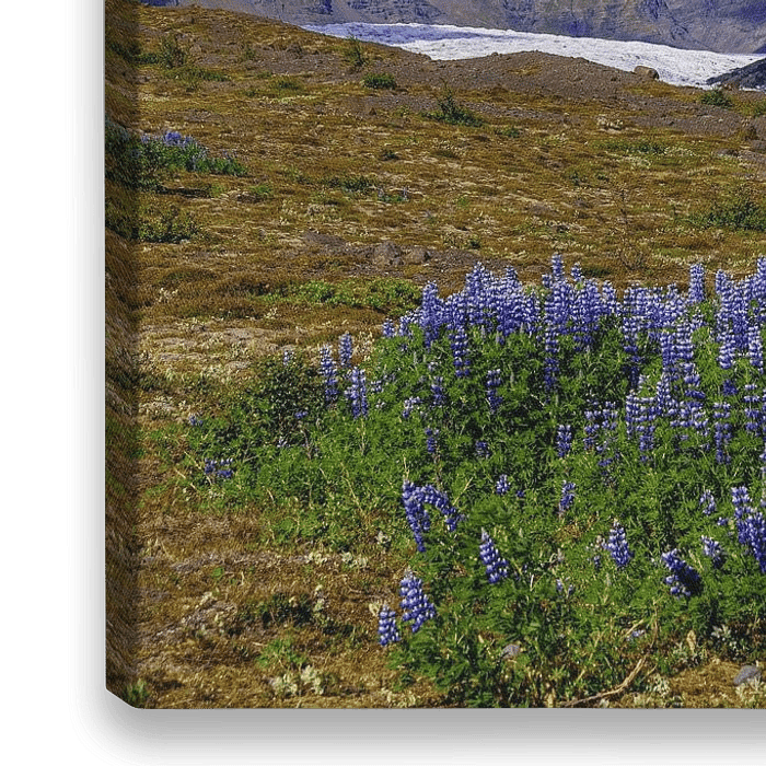 Bestelle dieses Landschafts-Wandbild Isländischer Gletscher mit Lupinen von Adelheid Smitt als Reproduktion auf Leinwand, Alu-Dibond, als Poster, Fototapete oder Acrylglasbild.
