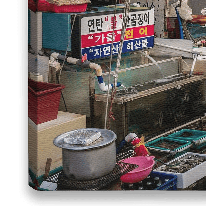 Jagalchi-Fischmarkt mit Fisch und Ständen in Busan, Südkorea an einem sonnigen Wintertag. Bunter Fischmarkt mit Werbeschildern.