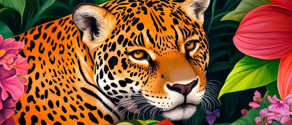 Inmitten üppiger, farbenfroher Blüten versteckt sich ein majestätischer Jaguar, der mit seinen auffälligen Fellmustern im Kontrast zur tiefgrünen Botanik steht. Dieses lebendige Kunstwerk bringt einen Hauch von Dschungel-Exotik und bietet sich perfekt für das Wohnzimmer an, wo es Gespräche anregen und die Sinne beleben kann.