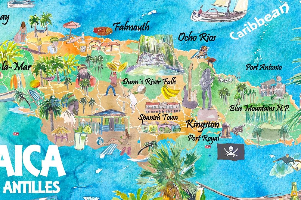 Jamaika Illustrierte Reisekarte mit Straßen und Highlights