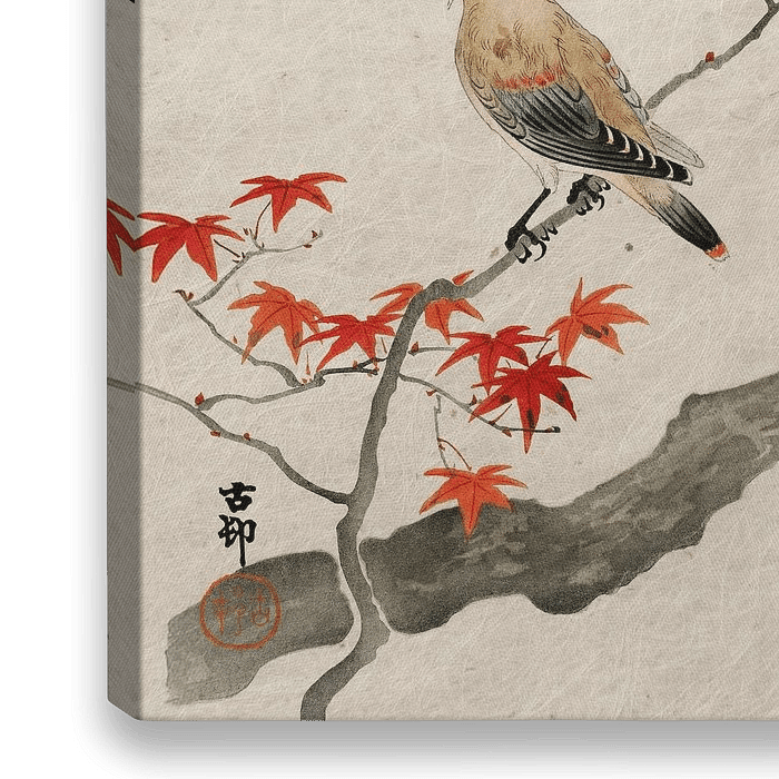 Das Original ist ein japanischer Farbholzschnitt, der einen japanischen Pestvogel (Japanischer Seidenschwanz) darstellt. Der Vogel sitzt auf einem verwitterten Ast eines japanischen Ahornbaums, umgeben von leuchtend roten Herbstblättern.…