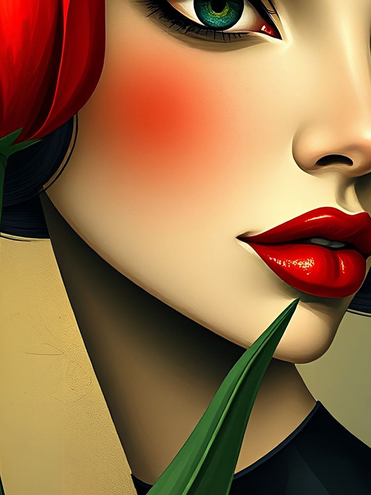 Porträt einer sehr jungen Frau, die zärtlich von einer wunderschönen Tulpe umarmt wird, deren rote Farbe perfekt mit dem Lippenstift und dem Messgewand dieser Person harmoniert. Die rote Farbe ist das Bindeglied zwischen der jungen Frau und der Blume, die untrennbar miteinander verbunden und wie in einer Kontinuität zueinander zu sein scheinen.