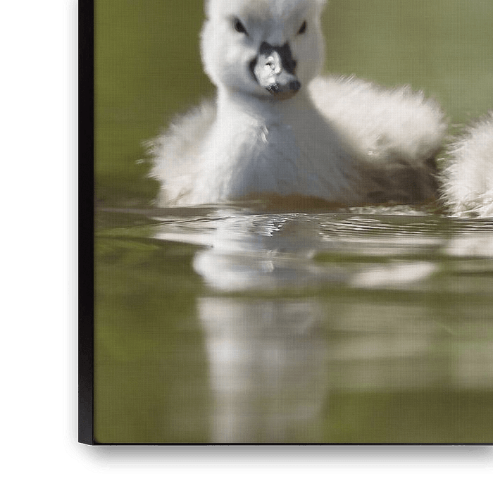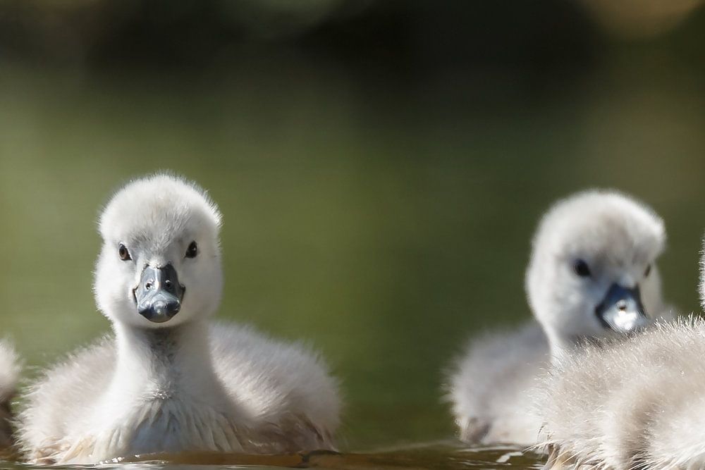 Junge Schwäne schwimmen in einer Gruppe durch das Wasser. Sie sind noch ganz in weiche Daunen gehüllt und suchen nach kleinen Fliegen, die über das Wasser fliegen. Vater und Mutter sind in der Nähe, um ein Auge auf sie zu haben.