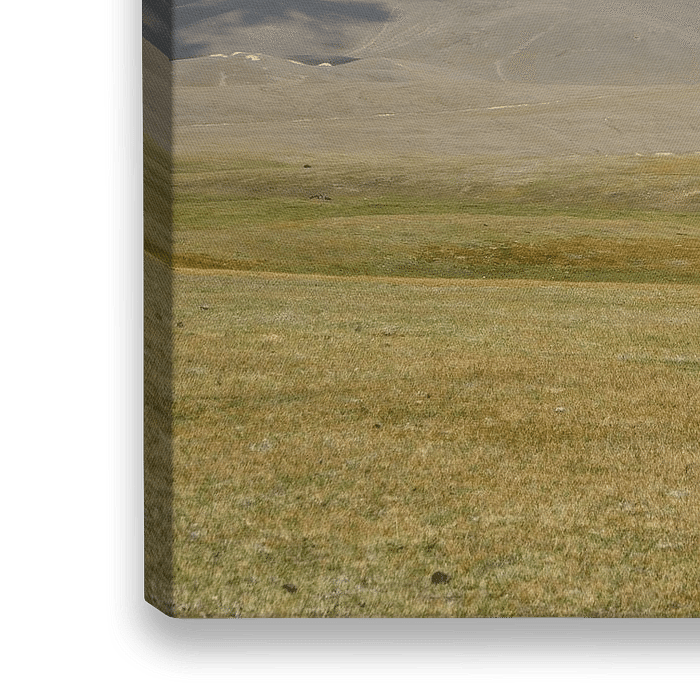 Jurten auf der grasbewachsenen Song-Kul-Ebene in Zentralkirgisistan mit Wolken und Hügeln im Hintergrund
