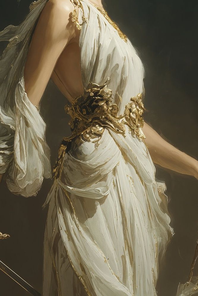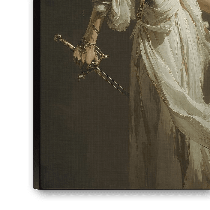 Eine ätherische Frau in einem fließenden weißen Kleid, umhüllt von Geheimnis und Anmut, hält die klassischen Symbole der Gerechtigkeit – Schwert und Waage. Der dramatische Hell-Dunkel-Effekt und die dynamische Pose schaffen eine zeitgenössische Interpretation der Justitia, bei der die traditionelle Augenbinde durch eine dekorative Maske mit goldenen Akzenten ersetzt ist.