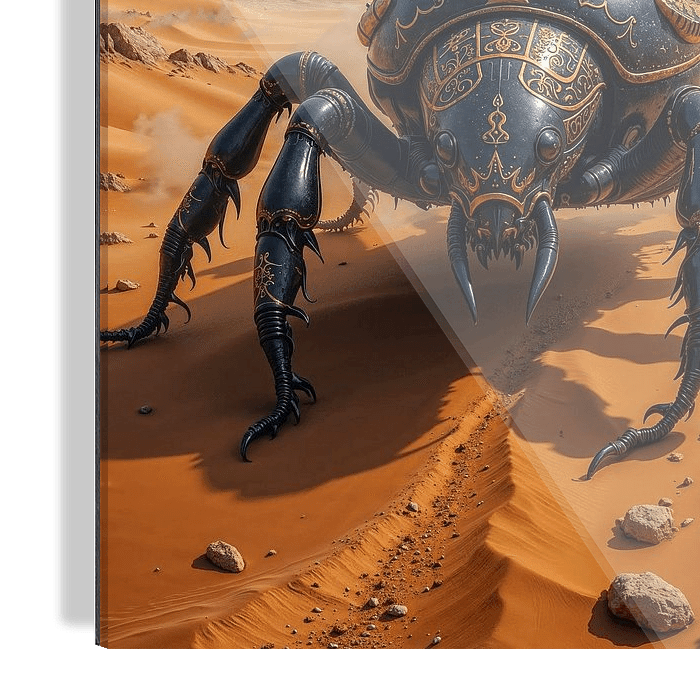 Ein monumentaler Skarabäus aus dunklem Metall bewegt sich durch den heißen Sand der Wüste. Seine fein verzierten Panzerplatten tragen goldene Ornamente, während seine Beine tiefe Spuren im Boden hinterlassen. Im Hintergrund erheben sich die ägyptischen Pyramiden unter einem dramatisch leuchtenden Himmel, der von Staub, Wolken und…