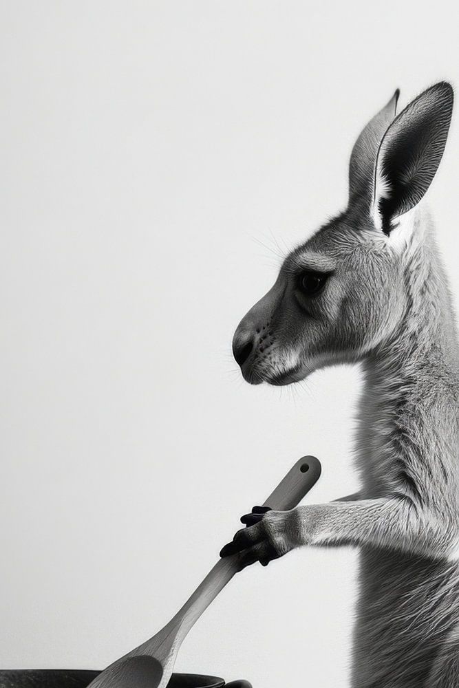 Ein neugieriges Känguru, ausgestattet mit einem Kochlöffel, steht vor einem schlichten schwarzen Topf – eine amüsante Szenerie, die die Fantasie anregt. Die monochrome Darstellung verstärkt den humorvollen Charme des Motivs. Dieses einzigartige Kunstwerk bringt Leben und Spaß in die Küche und sorgt für Gesprächsstoff bei jedem Besuch.