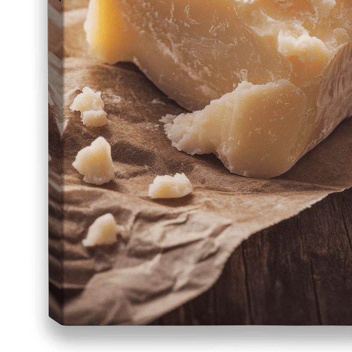 Ein rustikales Stück Käse, golden schimmernd und von der Zeit gezeichnet, ruht auf braunem Pergament. Die raue Textur und die unregelmäßigen Brüche laden ein, in die Welt intensiver Aromen einzutauchen. Gekrönt von krümeligen Resten entfaltet sich eine Geschichte von Handwerk und Tradition, die die Sinne verführt.
