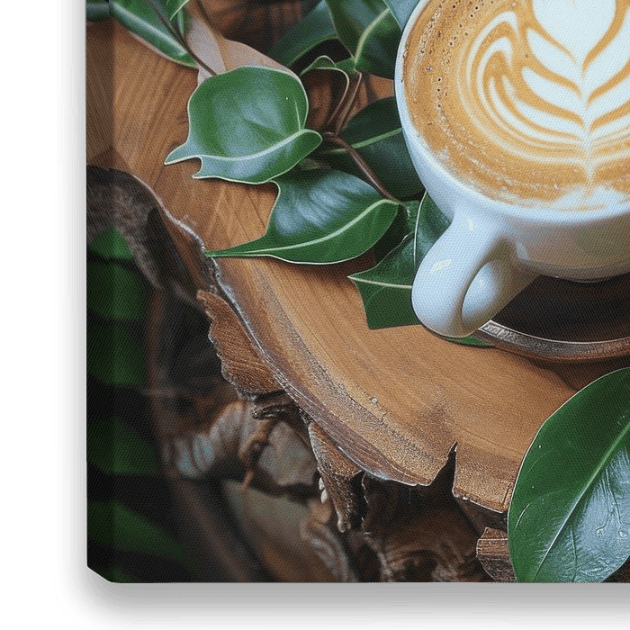 Dieses Kunstwerk fängt die Essenz eines entspannten Kaffeemoments ein, indem es zwei kunstvoll gestaltete Latte in schwarzen Tassen zeigt, umgeben von üppigem Grün. Die Kombination aus den detailreichen Blättern und der geschmackvollen Latte Art vermittelt eine Atmosphäre der Ruhe und des Genusses. Ideal für Cafés, Küchen oder…