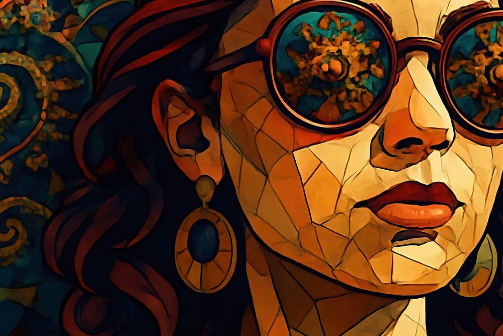Ein Porträt im Stil eines Mosaiks oder einer Glasmalerei, in dessen Mittelpunkt eine Frau steht. Ihr Gesicht besteht aus zahlreichen geometrischen Flächen in warmen, erdigen Tönen. Sie trägt eine auffällige, runde Sonnenbrille, in der sich ein psychedelisches, blumenartiges Muster spiegelt. Im Hintergrund fließen lebendige, spiralförmige Muster und farbige Flächen ineinander und schaffen eine verträumte und künstlerische Atmosphäre. Das Werk strahlt ein Gefühl von Geheimnis und künstlerischer Komplexität aus.