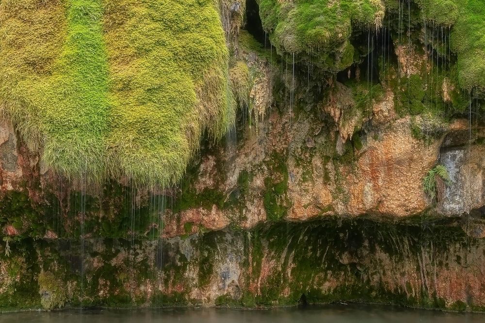Kallektuffquell" wird in Luxemburg fotografiert. Dies ist das Kallektuffquell. Eine schöne Felsformation mit Moos auf der Spitze. Oben auf dem Felsvorsprung befindet sich ein Regenwasserreservoir, das langsam durch das Moos versickert. Das Moos reinigt das Wasser und sorgt für frisches, klares Wasser. Durch die Wahl einer etwas längeren Belichtungszeit wollte ich das tropfende Wasser als Regen einfangen.