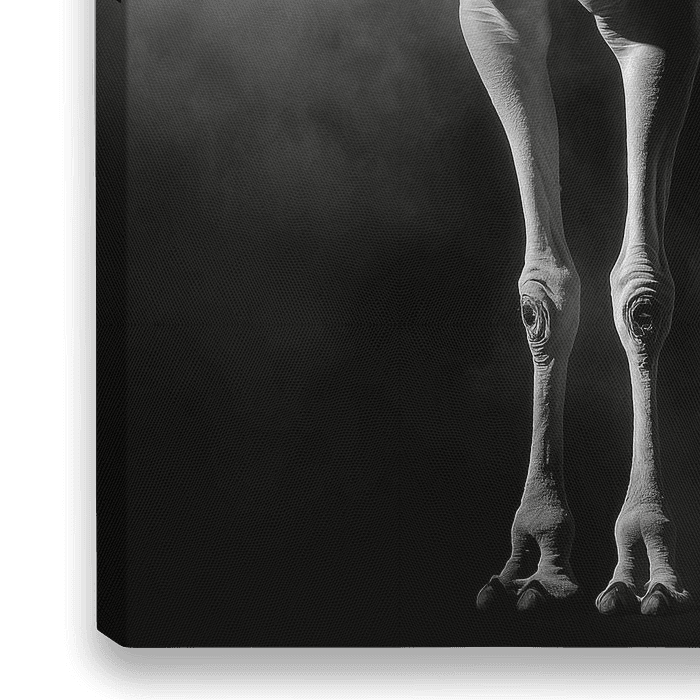 In einem faszinierenden Spiel aus Licht und Schatten erhebt sich eine majestätische Kamelfigur, deren knochige Eleganz eindrucksvoll zur Geltung kommt. Das mysteriöse Schwarz-Weiß-Spiel vermittelt eine fast surrealistische Atmosphäre, die perfekt für ein modernes Wohnzimmer oder kreatives Büro geeignet ist – ein Blickfang, der zum…
