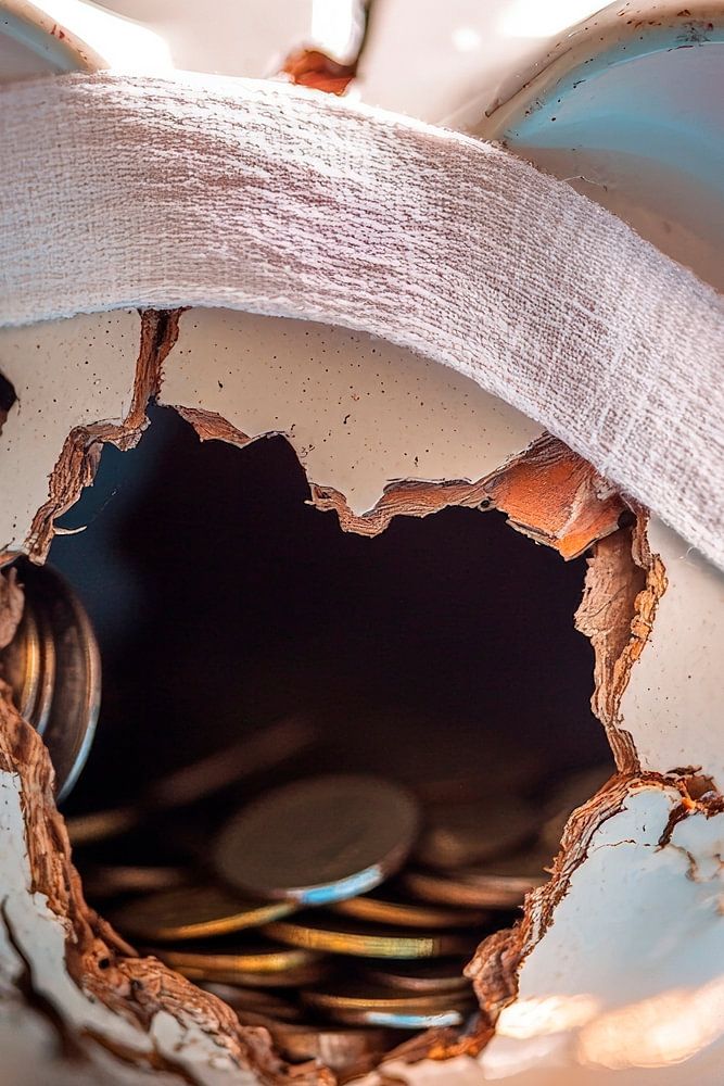 Ein charmantes Sparschwein mit einem gebrochenen Bauch, verbunden mit einem liebevollen Verband – ein Sinnbild von Verletzlichkeit und Hoffnung auf neues Wachstum. Die verstreuten Münzen erzählen Geschichten von Träumen und Sparzielen. Ideal für das Büro oder das Wohnzimmer, wo finanzielle Ziele im Fokus stehen und gleichzeitig ein Hauch von Kreativität und Humor den Raum belebt.